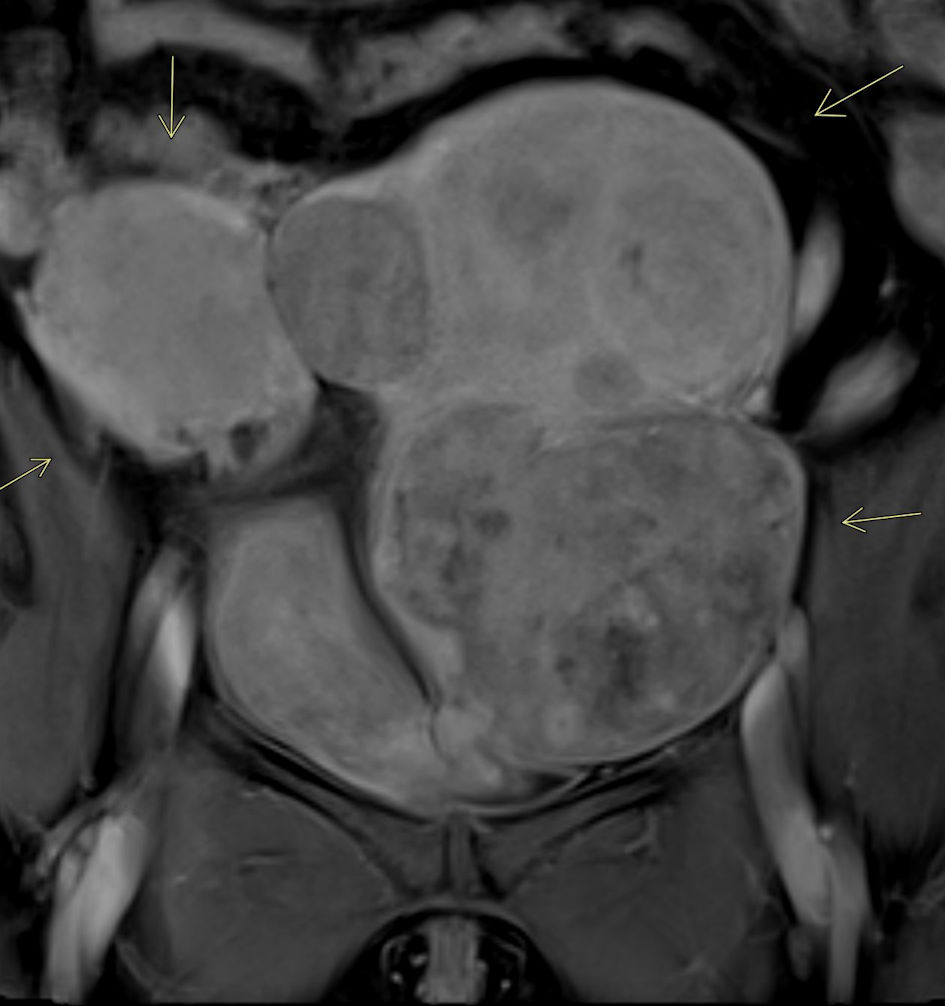 ![]() Click for large image | Figure 1. MRI of pelvis with intravenous contrast. Contrast-enhanced MRI of the pelvis demonstrates uterine didelphys with multiple large uterine fibroids, resulting in significant distortion of the endometrial cavity (arrows). |