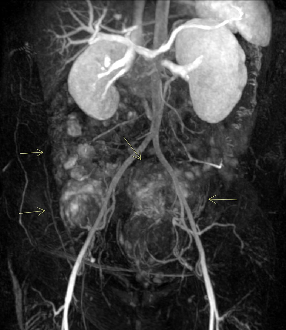 ![]() Click for large image | Figure 2. MRA of pelvis. Pelvic MRA confirms the highly vascular nature of the uterine fibroids, particularly notable in this case involving multiple large fibroids affecting both uteri (arrows). |