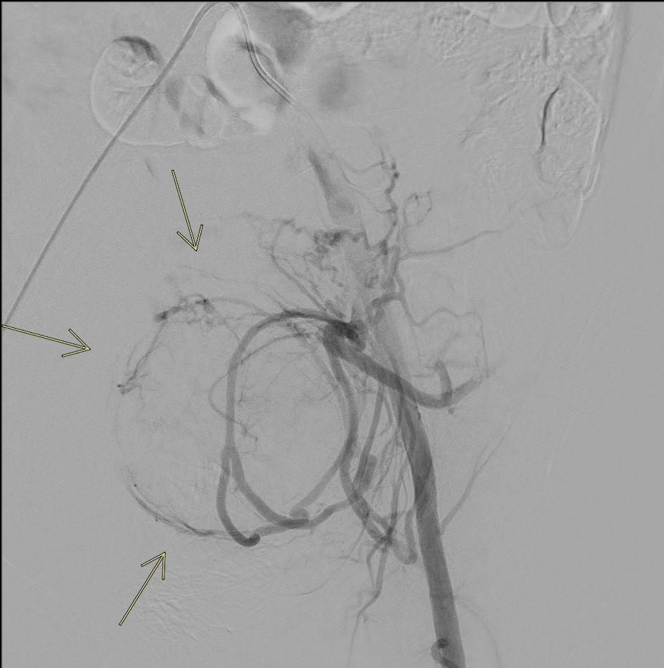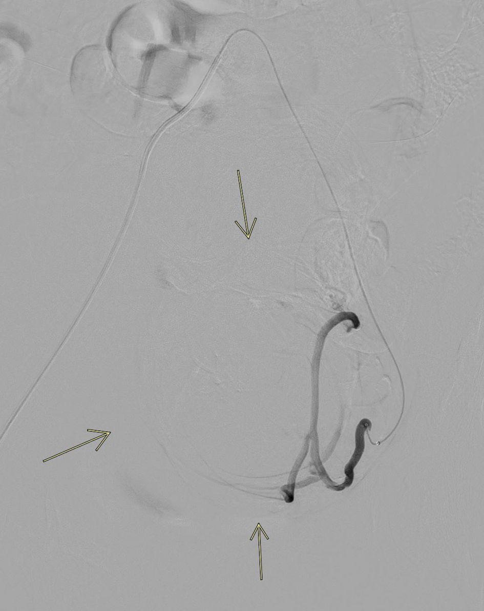 ![]() Click for large image | Figure 4. Post-embolization completion angiogram. Left uterine artery angiogram following embolization demonstrates no residual flow to the large fibroids, correlating with excellent radiologic and clinical outcomes (arrows). |