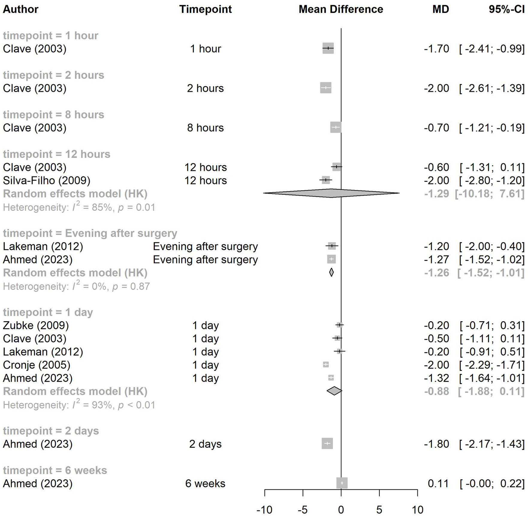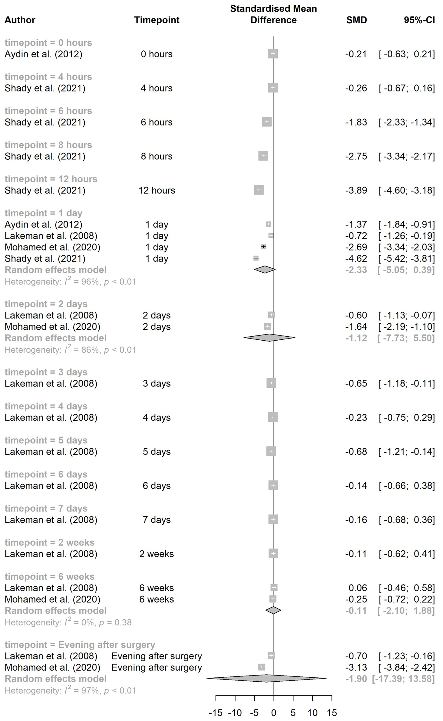 Meta-analyses estimated no significant difference between LigaSure and suturing for operative time (Fig. 4b, n = 395, MD -9.14 (95% CI: -25.26 to 6.99) min), LOS (Fig. 4c, n = 395, MD -0.67 (95% CI: -1.64 to 0.30) days), or patient-reported pain at “evening after surgery”, 1-day, 2-day, and 6-week timepoints (Fig. 5). Heterogeneity was substantial or high for all analyses, except patient-reported pain at 6 weeks for which there was no heterogeneity. Differing VAS were used to assess postoperative pain, therefore SMD was used in the meta-analysis. Single studies showed no significant difference in pain scores immediately postoperatively [28], at 4 h [33], and days 3 to 7 and 14 [31]. However, one study found scores were significantly lower in the LigaSure group at 6, 8, and 12 h postoperatively (P = 0.0001 for all) [33]. One study reported modal patient pain scores at days 1, 2, and 3 postoperatively and scores were higher in the suturing group at all timepoints [29] (Table 2).