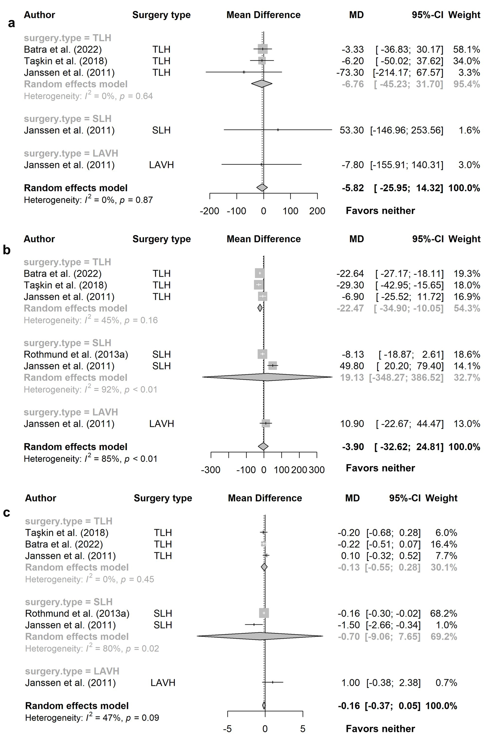 In this review, the meta-analysis of vaginal hysterectomy reported by Balgobin et al [6] was updated and new pair-wise meta-analyses were conducted for laparoscopic and abdominal hysterectomy. Meta-analyses were performed using the meta package in R version 4.4.1 with RStudio (PositSoftware, PBC). Results were expressed as mean difference (MD) or standardized mean difference (SMD) for continuous outcomes and as risk ratios for requirement for blood transfusion. The 95% confidence intervals (CIs) were reported, and results interpreted by examining the effect size. Outcomes and studies that could not be included in meta-analyses were synthesized narratively.