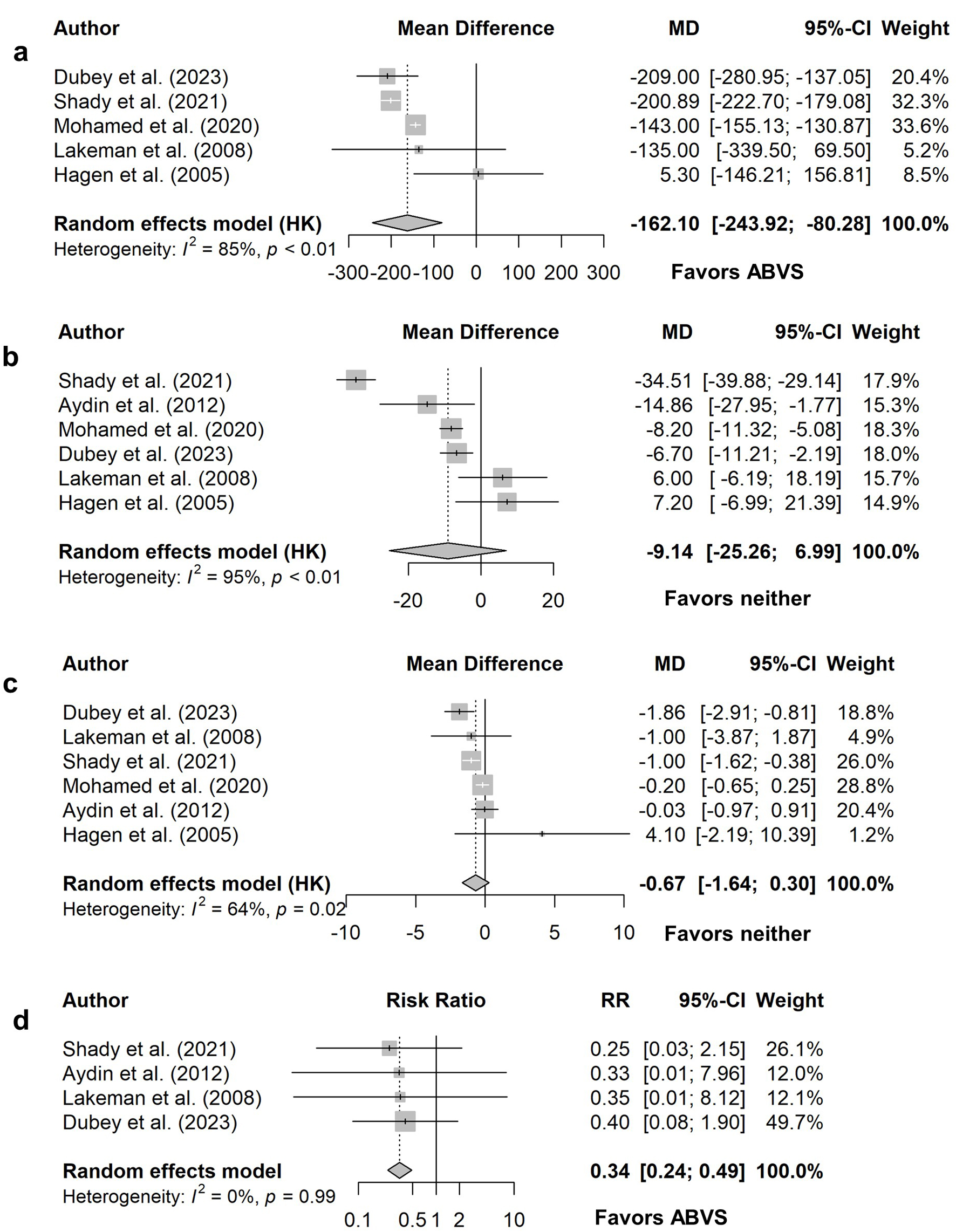 ![]() Click for large image | Figure 4. Abdominal hysterectomy comparison of ABVS to conventional suturing: (a) blood loss (mL), (b) operative time (min), (c) length of hospital stay (days), (d) blood transfusion required. For length of hospital stay reported by Dubey, only means for each group and a P value of 0.000 were reported; the MD and standard error were estimated by taking a conservative exact P value of 0.00049. ABVS: advanced electrosurgical bipolar vessel sealing; CI: confidence interval; HK: Hartung-Knapp adjustment; MD: mean difference; RR: risk ratio. |