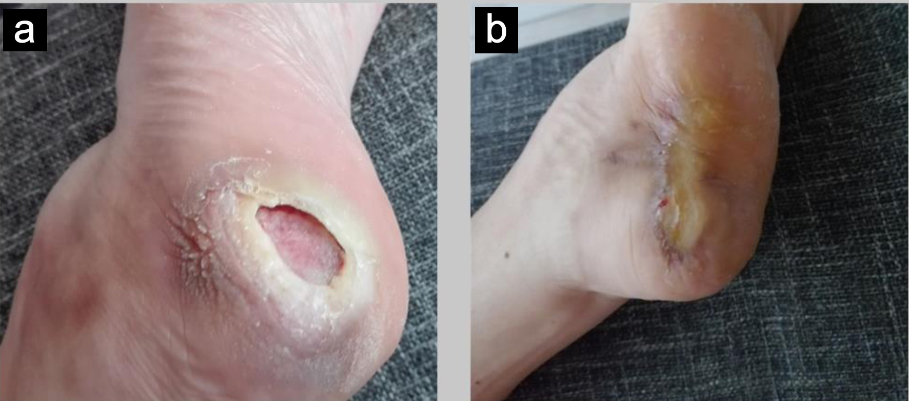 ![]() Click for large image | Figure 2. Clinical presentation of the right heel pressure ulcer in 2018 (a) and its progression 1 year later in 2019 (b). |