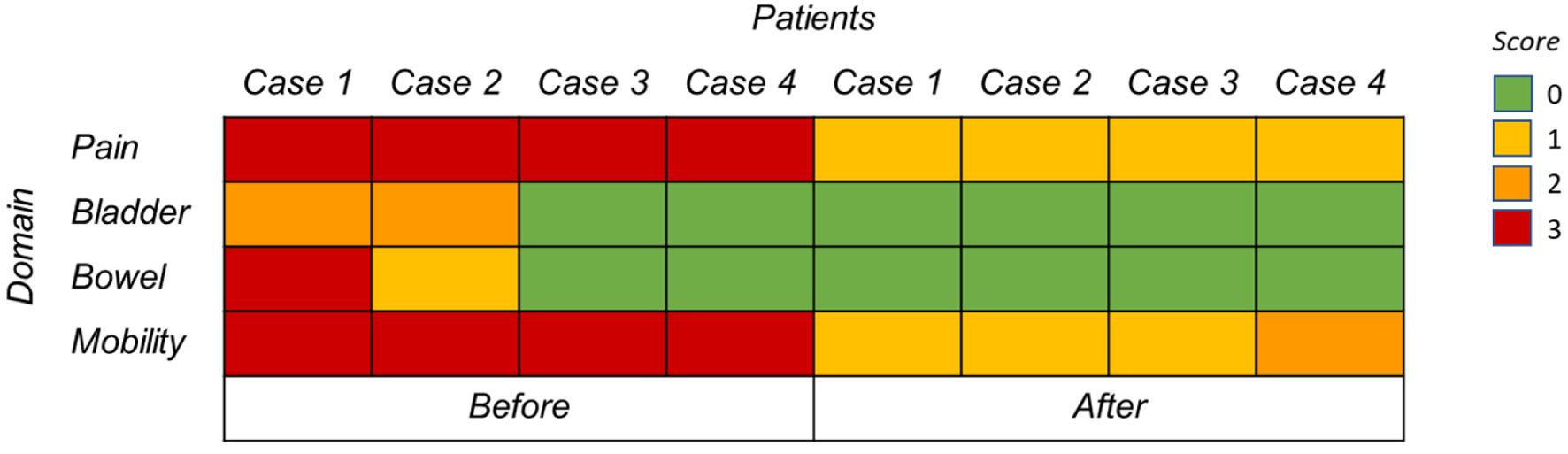 To evaluate and classify patient outcomes, a retrospective qualitative case analysis was conducted on women diagnosed with lumbosacral endometriosis and treated at the certified Endometriosis Centre at Charite Universitatsmedizin Berlin. Eligible cases were identified through electronic medical records and included women aged 20 to 40 years at first diagnosis, with lumbosacral endometriosis confirmed by imaging or histology, who had received medical (hormonal) therapy and had documented follow-up of at least 18-month to 6 years with symptom reporting. Patients were excluded if follow-up data were incomplete or if hormonal treatment had not been administered. Using the Charite hospital information system, all relevant documents and imaging findings were reviewed and incorporated into the evaluation of the patients. Particular attention was given to the trajectory of pain, including narrative descriptions of pain intensity, numerical ratings on a 0–10 visual analogue scale when available, and changes in analgesic consumption. Organ-related dysfunction was also carefully assessed, encompassing bladder and bowel disturbances, sexual dysfunction, neurogenic symptoms such as paresthesia or hyperesthesia in the lower limbs, and limitations in mobility. Due to the small cohort size and incomplete quantitative pain scores, formal statistical analyses were not performed. Instead, outcomes are presented as individual qualitative narratives, supplemented with graphical representations to highlight patterns in pain relief, organ function, and mobility before and after treatment. All narrative chart entries on pain, bladder and bowel dysfunction, and mobility were converted into an ordinal four-point scale (0 = none, 1 = mild, 2 = moderate, 3 = severe), which was then used to generate heat maps illustrating symptom severity prior to and following hormonal therapy. All patients provided informed consent for the presentation of their individual medical histories.